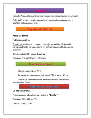 Este documento presenta el perfil profesional de Jesica María Hurtado Bolaños, una estudiante colombiana nacida en 1995 que aspira a obtener un título en Medicina. Actualmente cursa el décimo grado de secundaria y el noveno grado de bachillerato. Ha trabajado como publicista creativa para una organización de salud y economía. Habla inglés a nivel intermedio y tiene experiencia con Microsoft Office. Proporciona referencias personales y familiares, incluida una anécdota sobre el fallecimiento de su ab