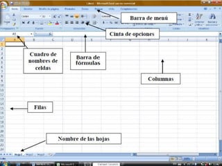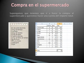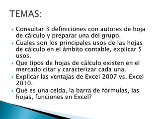 Este documento discute el uso de hojas de cálculo en contabilidad y proporciona ejemplos de cómo usar una hoja de cálculo para realizar un presupuesto familiar. También define conceptos básicos de Excel como celdas, hojas y funciones y compara las ventajas de Excel 2007 vs Excel 2010.