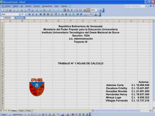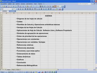 Este documento presenta una agenda para un trabajo sobre hojas de cálculo. Explica los orígenes y componentes básicos de las hojas de cálculo, como celdas y operaciones aritméticas. También describe las ventajas de las hojas de cálculo y aplicaciones de software libre y propietario. Explica conceptos como símbolos de agrupación, orden de prioridad de operaciones, operaciones con constantes y variables, referencias relativas y absolutas, y funciones. Finalmente, cubre temas como ordenamiento de datos, tablas dinámicas,