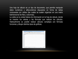 Una hoja de cálculo es un tipo de documento que permite manipular datos numéricos y alfanuméricos dispuestos en forma de tablas compuestas por celdas. Las celdas permiten insertar valores y fórmulas para realizar cálculos complejos. Las hojas de cálculo más conocidas son Microsoft Excel, Numbers de Apple, Lotus 1-2-3 y Calc, y se usan comúnmente para bases de datos numéricas, cálculos, informes y gráficos.