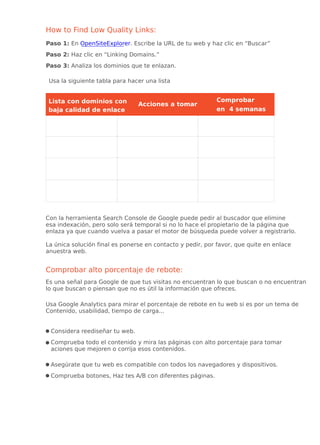 El documento proporciona instrucciones para identificar y corregir factores que podrían penalizar un sitio web en los algoritmos de Google, como Panda, Penguin y Hummingbird. Incluye pasos para encontrar enlaces de baja calidad, contenido duplicado, altas tasas de rebote, falta de visitantes recurrentes y contenido repetitivo, así como consejos para evitar penalizaciones relacionadas con estos factores. También explica las diferencias entre Panda, Penguin y Hummingbird y cómo aprovechar las características de búsqueda conversacional de Hummingbird
