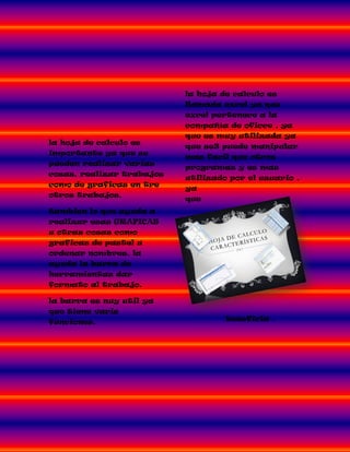 La hoja de cálculo es un programa que permite manipular datos numéricos organizados en celdas ordenadas en filas y columnas. Las celdas contienen valores o fórmulas y permiten realizar cálculos básicos como suma, resta, multiplicación y división mediante el uso de operadores como el asterisco o la barra. La hoja de cálculo más popular es Excel, que ofrece herramientas para crear gráficas y ordenar información de manera fácil.