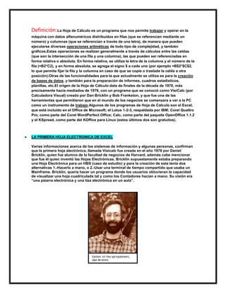 La hoja de cálculo es un programa que permite organizar y operar datos alfanuméricos en filas y columnas, y realizar cálculos entre las celdas formadas por la intersección de las filas y columnas. VisiCalc, creado en 1979, fue el primer programa de hoja de cálculo y revolucionó el uso de computadoras personales en los negocios. Algunos programas populares de hoja de cálculo son Excel, Lotus 1-2-3, Corel Quattro Pro, Calc y KSpread.
