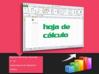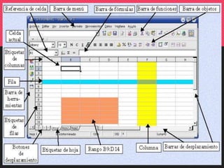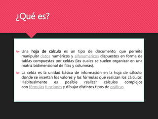 El documento describe el origen y propósito de las hojas de cálculo. Explica que Dan Bricklin creó la primera hoja de cálculo llamada VisiCalc en la década de 1970 para replicar cálculos en una pizarra de forma digital. También describe las características básicas de una hoja de cálculo como celdas, filas, columnas y operaciones aritméticas simples usando símbolos. Finalmente, menciona algunos ejemplos populares de hojas de cálculo como Excel, Google Sheets y OpenOffice Calc.