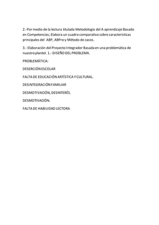 Este documento presenta un portafolio de evidencias de actividades realizadas en el Módulo III de un diplomado en competencias docentes. Incluye un cuadro comparativo de las características del aprendizaje basado en problemas, el método de casos y el aprendizaje basado en proyectos. También describe un proyecto integrador desarrollado por una alumna basado en una problemática de su plantel, incluyendo la identificación de la problemática, diseño del problema y metodología.