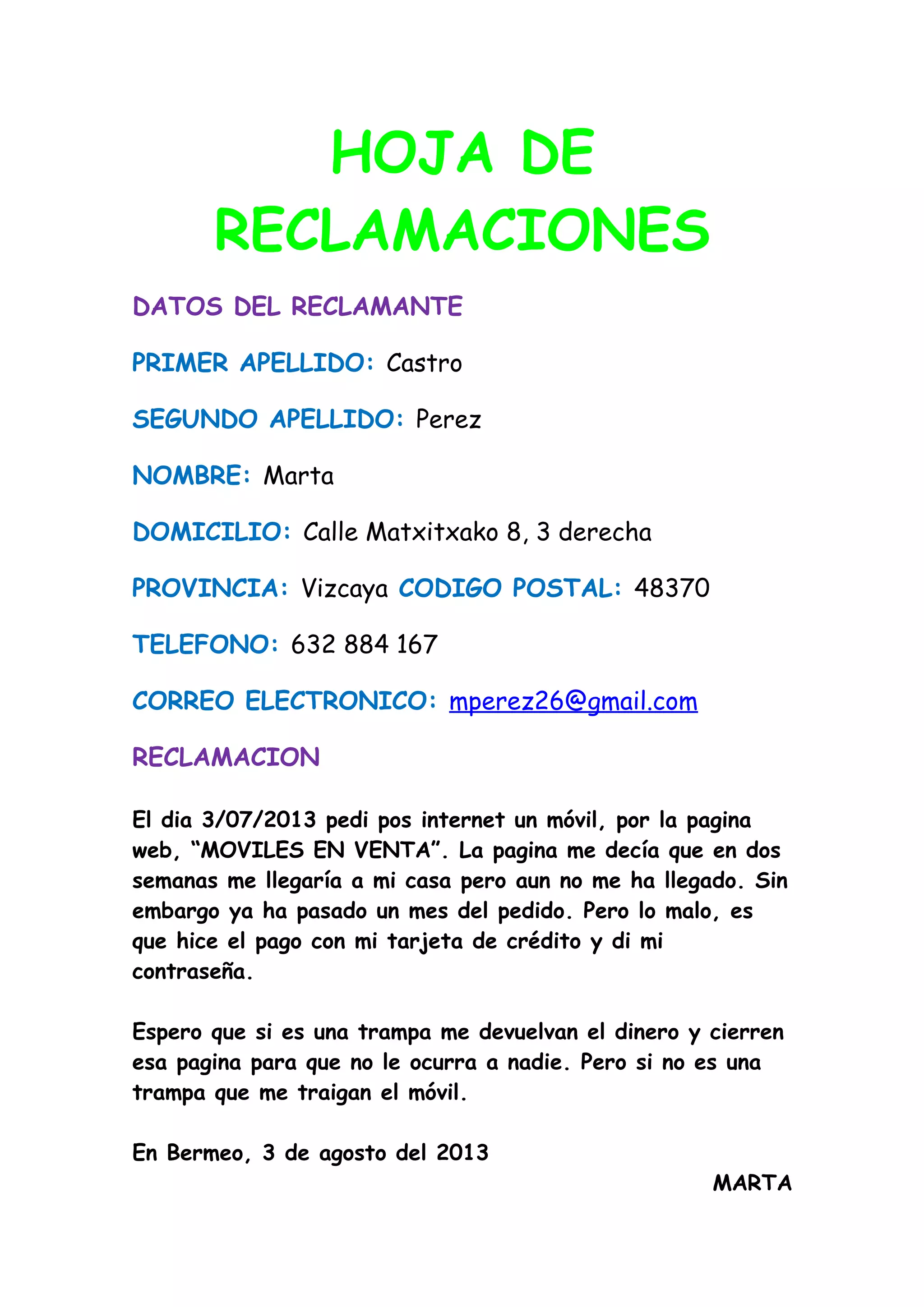 Marta Castro Perez presenta una reclamación porque realizó un pedido de un móvil a través de la página web "MOVILES EN VENTA" hace un mes, pero todavía no ha recibido el producto. Teme que sea una estafa, ya que proporcionó su contraseña de tarjeta de crédito para realizar el pago. Solicita que le devuelvan el dinero o le entreguen el móvil pedido.