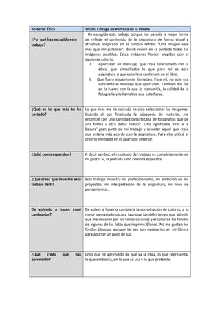 Este documento describe un proyecto de collage en la portada de una libreta para la asignatura de Ética. El estudiante explica que eligió este trabajo porque una imagen vale más que mil palabras para reflejar visualmente el contenido de la asignatura. Describe que seleccionó imágenes que aportaran un mensaje relacionado con la ética y que fueran visualmente atractivas. Explica que lo más difícil fue reducir la gran cantidad de imágenes encontradas al seleccionar solo aquellas más adecuadas para la asignatura según el criterio estable