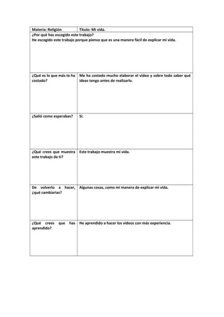 Este documento es una reflexión sobre un trabajo escolar en el que el autor explica su vida a través de un video. El autor escogió este trabajo porque pensó que sería una manera fácil de explicar su vida. Creó el video con dificultad, especialmente al elaborar las ideas principales antes de grabar. El resultado final cumplió con sus expectativas y cree que el video muestra aspectos fundamentales sobre su vida. Si tuviera que volver a hacerlo, mejoraría su manera de explicar su vida y ha aprendido a hacer videos con más experiencia.