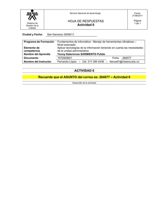 El documento es una hoja de respuestas del Servicio Nacional de Aprendizaje para la actividad 6 de un programa de formación en manejo de herramientas ofimáticas a nivel avanzado. La hoja incluye información sobre la ciudad, fecha, programa de formación, elemento de competencia, nombre del aprendiz, documento de identificación, nombre del instructor e indica que el asunto del correo electrónico enviado debe ser "264077 - Actividad 6".