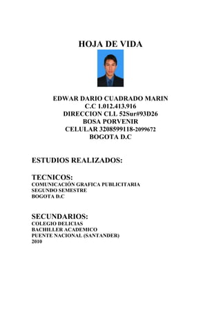 Este documento presenta el hoja de vida de Edwar Dario Cuadrado Marin. Resume su experiencia educativa incluyendo estudios técnicos en comunicación gráfica publicitaria y estudios secundarios. También resume su experiencia laboral en atención al cliente y ventas. Presenta su perfil laboral y personal, describiendo sus habilidades, valores y metas. Finalmente incluye referencias personales y familiares.