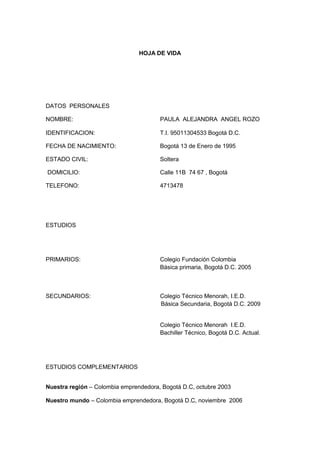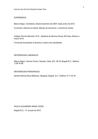 Este documento es la hoja de vida de Paula Alejandra Angel Rozo, que incluye sus datos personales como nombre, identificación, fecha de nacimiento y estado civil. También detalla su educación primaria, secundaria y estudios complementarios, así como su experiencia laboral como vendedora y asistente de servicio social. Finalmente, proporciona referencias laborales y personales.