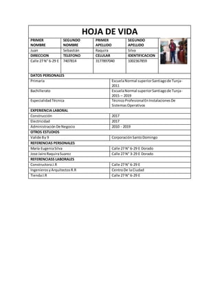 Juan Sebastián Raquira Silva presenta su hoja de vida con su información personal, educación, experiencia laboral y referencias. Completó la primaria y bachillerato en la Escuela Normal Superior de Tunja y estudió instalaciones de sistemas operativos. Tiene experiencia en construcción, electricidad y administración de negocios desde 2010 a 2019. Proporciona referencias personales y laborales.