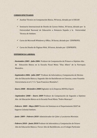 Este currículum vitae resume la información personal, educación y experiencia laboral de Marco Vinicio Oñate Guevara. Obtuvo una licenciatura en Informática y Computación de la Universidad Técnica de Ambato. Tiene experiencia como profesor de computación en varias escuelas y colegios. También trabajó como digitador, técnico de sistemas, administrador de cyber y locutorios, instructor y verificador electoral.
