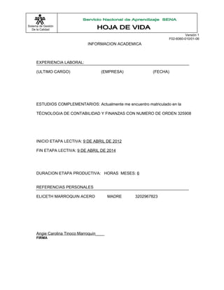 Este documento presenta los datos personales de Angie Carolina Tinoco Marroquín, incluyendo su nombre, número de identificación, lugar y fecha de nacimiento, domicilio, género, contacto, educación y experiencia laboral. Detalla su formación académica primaria, secundaria y técnica, así como sus estudios actuales de Tecnología en Contabilidad y Finanzas. Además, provee información sobre el inicio y fin de su etapa lectiva y los detalles de su madre como referencia personal.