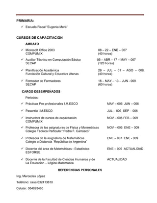 Este hoja de vida resume la información personal, formación académica y experiencia laboral de Jéssica Paola López Arboleda. Detalla sus estudios superiores en la Maestría en Gerencia y Liderazgo Educacional y la carrera de Ingeniería Industrial, así como sus cursos de capacitación y cargos desempeñados como instructora, profesora de física, matemáticas y estadística.