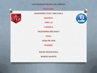 Este documento es la hoja de vida de David Telenchana Flores, un estudiante de 19 años de edad que cursa el cuarto año de la carrera de Ingeniería Mecánica en la Universidad Técnica de Ambato. Incluye información personal, formación académica y experiencia laboral en construcciones metálicas y referencias personales.