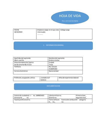 Este documento es una hoja de vida de Andrés Nicolás Marín Carrillo para solicitar empleo. Contiene información personal como dirección, teléfono, educación y experiencia laboral anterior. También incluye secciones de información familiar, aptitudes, referencias personales y el proceso de selección.