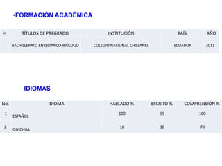 Este documento es la hoja de vida de Dagnnes Rolando Guamán Paguay. Presenta su información personal como su nombre completo, fecha de nacimiento, lugar de nacimiento, número de cédula de identidad y contactos. Detalla su formación académica incluyendo su bachillerato en química-biología obtenido en el Colegio Nacional Chillanes en el 2011. Además, proporciona detalles sobre sus habilidades en español y quichua. Actualmente estudia en la Escuela Superior Politécnica de Chimboraz