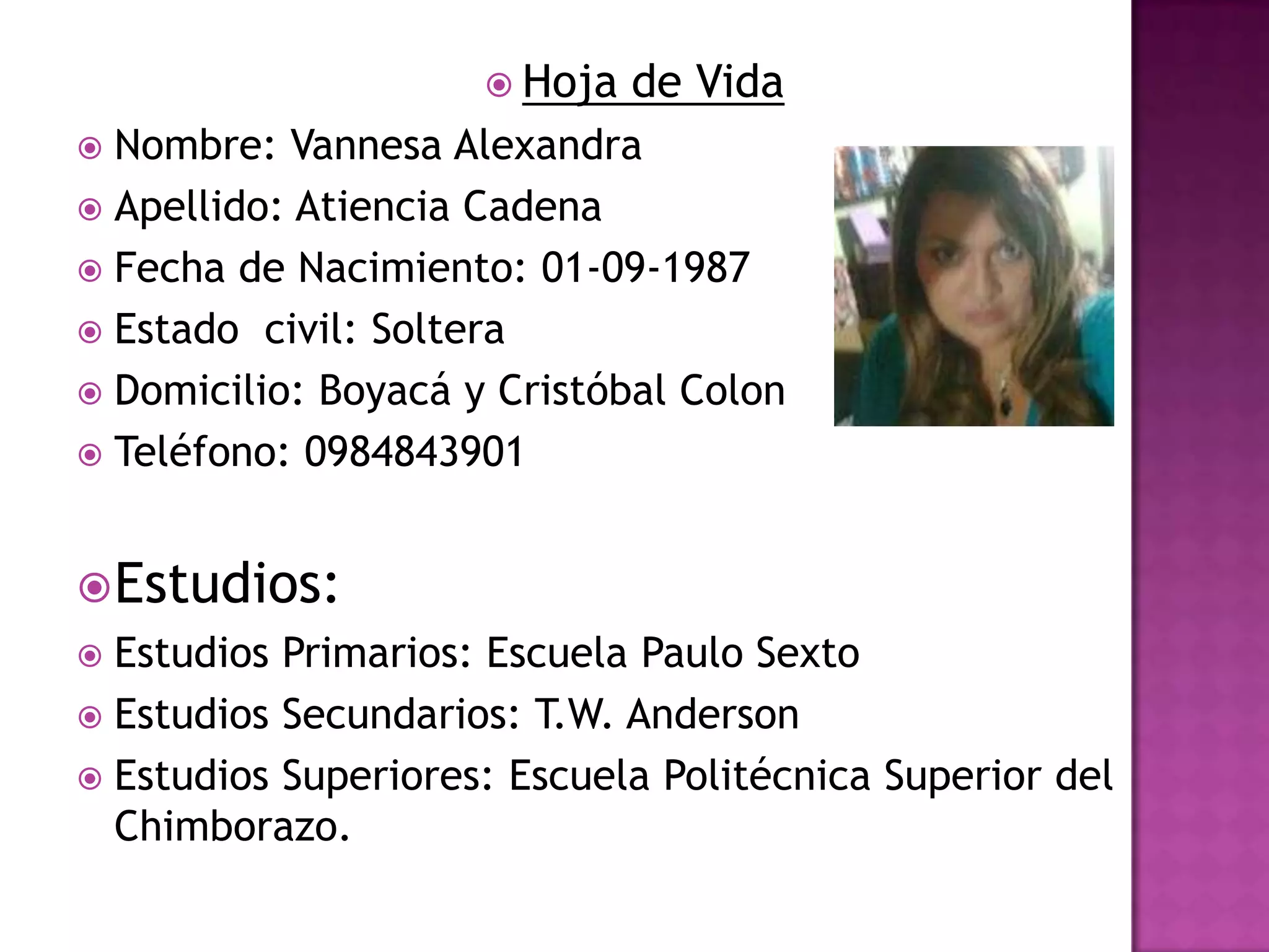 La hoja de vida presenta los datos personales de Vanessa Alexandra Atiencia Cadena, nacida el 1 de septiembre de 1987 y soltera. Incluye su dirección en Boyacá y Cristóbal Colon y número de teléfono, así como sus estudios primarios y secundarios y la Escuela Politécnica Superior del Chimborazo para estudios superiores.