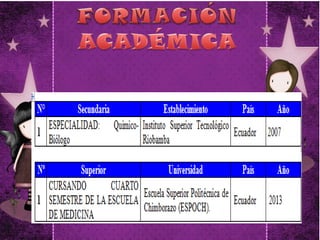 Este documento presenta información personal de Ruth Marianela Ortega Aldaz, incluyendo su nombre completo, número de cédula, fecha y lugar de nacimiento, estado civil, dirección y números de contacto. También menciona algunos temas de interés para ella como primeros auxilios, emprendimientos en salud, estadística básica y pastelería/cocina ecuatoriana.
