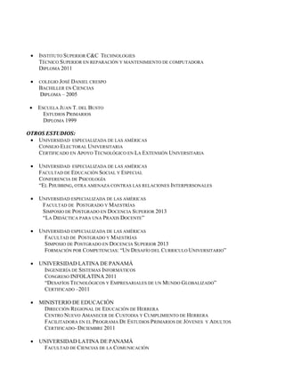 Este documento presenta el currículum vitae de Katherine Quintero Cortez, una profesional panameña con experiencia en educación y tecnologías de la información. Se destacan sus estudios universitarios en ingeniería de sistemas, profesorado y maestría, así como sus habilidades técnicas y experiencia laboral como docente, soporte técnico y digitalizadora.