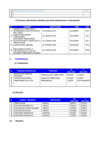 El documento presenta la hoja de vida de Víctor Hugo Vásconez Samaniego, que incluye sus datos personales, formación académica, cursos y seminarios recibidos, experiencia profesional como docente, directivo, capacitador y consultor, publicaciones, idiomas, información adicional y áreas de colaboración potencial.