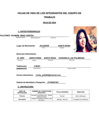 Este documento presenta la hoja de vida de Irina Yaditza Falcones Guamán. Contiene información personal como su lugar y fecha de nacimiento en Ecuador, su dirección, números de contacto, y número de cédula. También detalla su educación primaria y secundaria, incluyendo los nombres de las instituciones educativas y los títulos obtenidos.