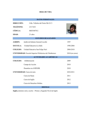 La hoja de vida presenta los datos personales, estudios y actividades académicas de una persona. Incluye su dirección, teléfono, cédula, edad, estudios desde el jardín de infantes hasta la universidad, y cursos y pasantías realizados en el colegio y la universidad, así como su dominio del idioma inglés en los niveles uno y dos.