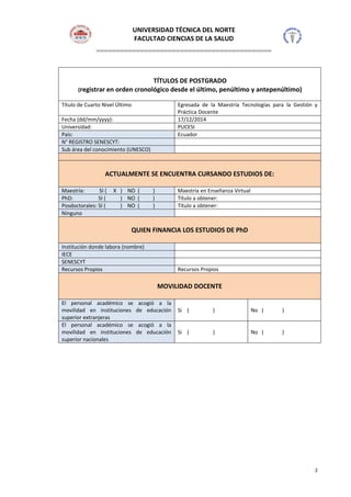 Este documento contiene información personal y profesional de Cristina Fernanda Vaca Orellana, docente de la Universidad Técnica del Norte. Incluye detalles sobre su formación académica como Ingeniera en Sistemas Computacionales y Maestría en Tecnologías para la Gestión y Práctica Docente, así como cursos y capacitaciones realizados. También proporciona información sobre su experiencia laboral como docente en la UTN desde 2013, y seminarios y talleres en los que ha participado los últimos cinco años.