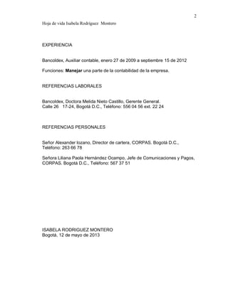 La hoja de vida presenta los datos personales, estudios y experiencia laboral de Isabela Rodríguez Montero. Incluye su nombre, identificación, fecha de nacimiento, estado civil, domicilio y contacto. Detalla que completó la educación secundaria en 2004 y realizó un curso de inglés de 180 horas en 2006. Tuvo experiencia como auxiliar contable en Bancoldex de 2009 a 2012. Proporciona referencias laborales de su empleo anterior y personales.