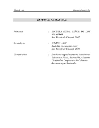 Este documento presenta la hoja de vida de Brayan Infante Uribe, incluyendo sus datos personales, estudios realizados, experiencia laboral en tres empresas diferentes como operador de surtido y embajador de servicios, y tres referencias personales. Brayan nació en 1990 en Bucaramanga, Santander y actualmente estudia su segundo semestre de licenciatura en Educación Física, Recreación y Deporte en la Universidad Cooperativa de Colombia.