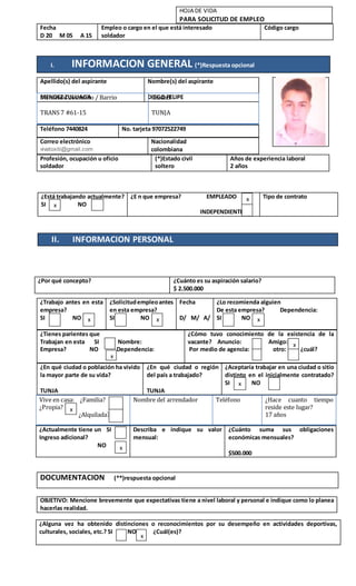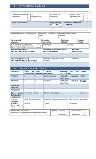 Diego Felipe Méndez Zuluaga está solicitando empleo como soldador. Actualmente tiene 2 años de experiencia laboral como soldador y está estudiando una carrera técnica de soldadura en la Universidad Pedagógica y Tecnológica de Colombia. Su último empleo fue como trabajador en una fábrica, donde trabajó durante 3 meses.