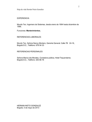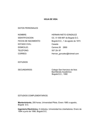 Este documento presenta la hoja de vida de Hernán Nieto González. Incluye sus datos personales como nombre, identificación, fecha de nacimiento y estado civil, así como su domicilio, teléfono y correo electrónico. Detalla sus estudios secundarios y complementarios, así como su experiencia laboral como ingeniero de sistemas en Mundo Tec desde 1994 a 1996. Finalmente, proporciona referencias laborales y personales.