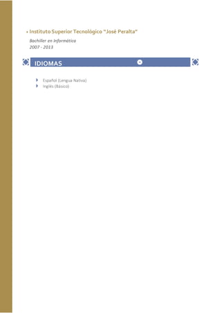 Este documento presenta el currículum de Mayra Gissela Siguencia Cruz, una estudiante de 18 años de edad que actualmente cursa el bachillerato en Informática en el Instituto Superior Tecnológico "José Peralta". Ella asistió a la Escuela Fiscal Mixta "Dr. Rafael Palacios Dávila" de 2000 a 2007 y tiene experiencia trabajando en atención al cliente en Zona Zhoes desde mayo de 2010. Habla español con fluidez y tiene un nivel básico de inglés.