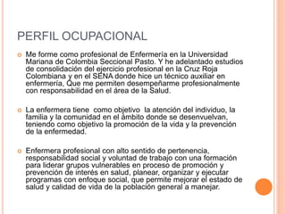 2) Actualmente trabaja como enfermera superior en la Clínica Proinsalud en Pasto, Colombia.