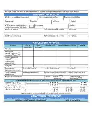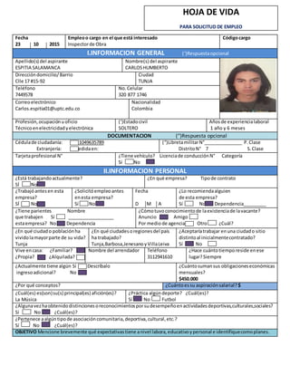 El documento presenta la hoja de vida de Carlos Humberto Espitia Salamanca, quien está solicitando el cargo de Inspector de Obra. La hoja de vida incluye información personal, familiar, educativa, laboral, de seguridad social y referencias. Espitia ha trabajado durante 1 año y 6 meses en cargos relacionados con electricidad y electrónica. Actualmente está desempleado y busca un nuevo trabajo como Inspector de Obra.