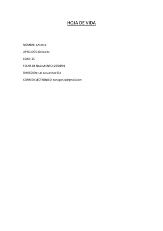 Antonio Gonzalez es un hombre de 25 años nacido el 24 de marzo de 1991 que vive en la dirección Las casuarinas 531 y puede ser contactado a través del correo electrónico tonygonza@gmail.com.