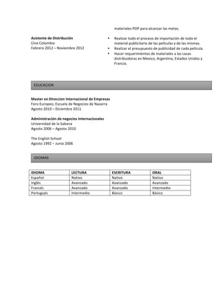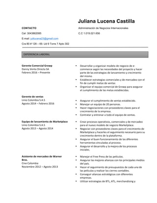 El documento presenta el resumen curricular de Juliana Lucena Castilla. Ella ha trabajado como gerente comercial en Growp y gerente de ventas en Linio Colombia, donde desarrolló estrategias comerciales y de mercadeo. También trabajó en el lanzamiento del modelo de negocio de marketplace en Linio y como asistente de mercadeo en Warner Bros. Cuenta con maestría en Dirección Internacional de Empresas y título en Administración de Negocios Internacionales. Domina el inglés y francés.