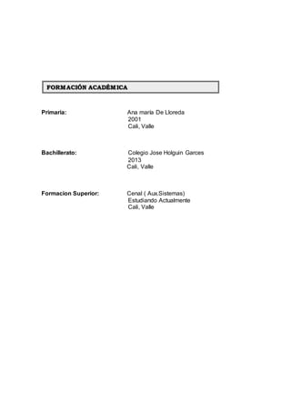 La hoja de vida presenta los datos personales y la experiencia laboral de Yuliana Andrea Rodríguez García. Incluye su nombre, documento de identidad, fecha y lugar de nacimiento, dirección, teléfono, correo electrónico, educación primaria y secundaria, formación superior actual en Cenal para Auxiliar de Sistemas, experiencia laboral previa de 2 años como visuteria en Poética, y referencias familiares y personales.