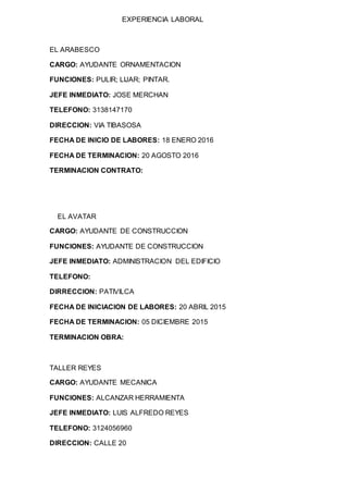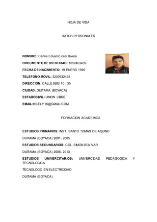 Carlos Eduardo Cely Rivera presenta su hoja de vida. Nació en 1995 en Duitama (Boyacá). Ha trabajado como ayudante de ornamentación, ayudante de construcción y ayudante de mecánica. Actualmente busca empleo y aspira a un salario de $700.000. Proporciona referencias familiares y personales para contacto.