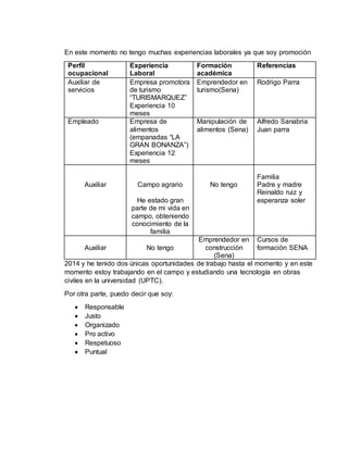 Carlos Andrés Ruiz Soler es un joven de 22 años nacido en Ramiriquí, Boyacá, Colombia. Actualmente trabaja en el campo y estudia una tecnología en obras civiles en la Universidad Pedagógica y Tecnológica de Colombia. Ha tenido dos experiencias laborales previas de 10 y 12 meses como auxiliar de servicios y empleado en una empresa de alimentos, respectivamente.