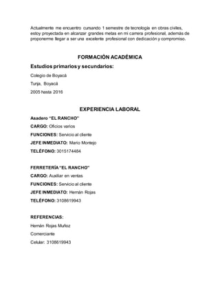 Paula Gabriela Rojas Montejo es una estudiante de tecnología en obras civiles de 24 años, originaria de Tunja, Boyacá, con experiencia laboral en servicio al cliente en un asadero y una ferretería. Se define como responsable, perseverante y comprometida con su formación profesional. Sus referencias laborales incluyen a comerciantes y un constructor de su localidad.