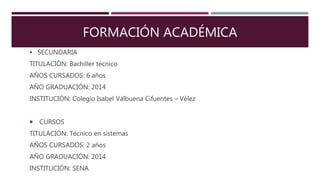 Este documento es el hoja de vida de Jessenia Velasco Saldarriaga. Presenta su información personal, formación académica que incluye bachillerato, técnico en sistemas y licenciatura en educación preescolar, formación complementaria con especialización y maestría. También detalla su experiencia laboral en una sala de belleza y referencias personales y familiares.