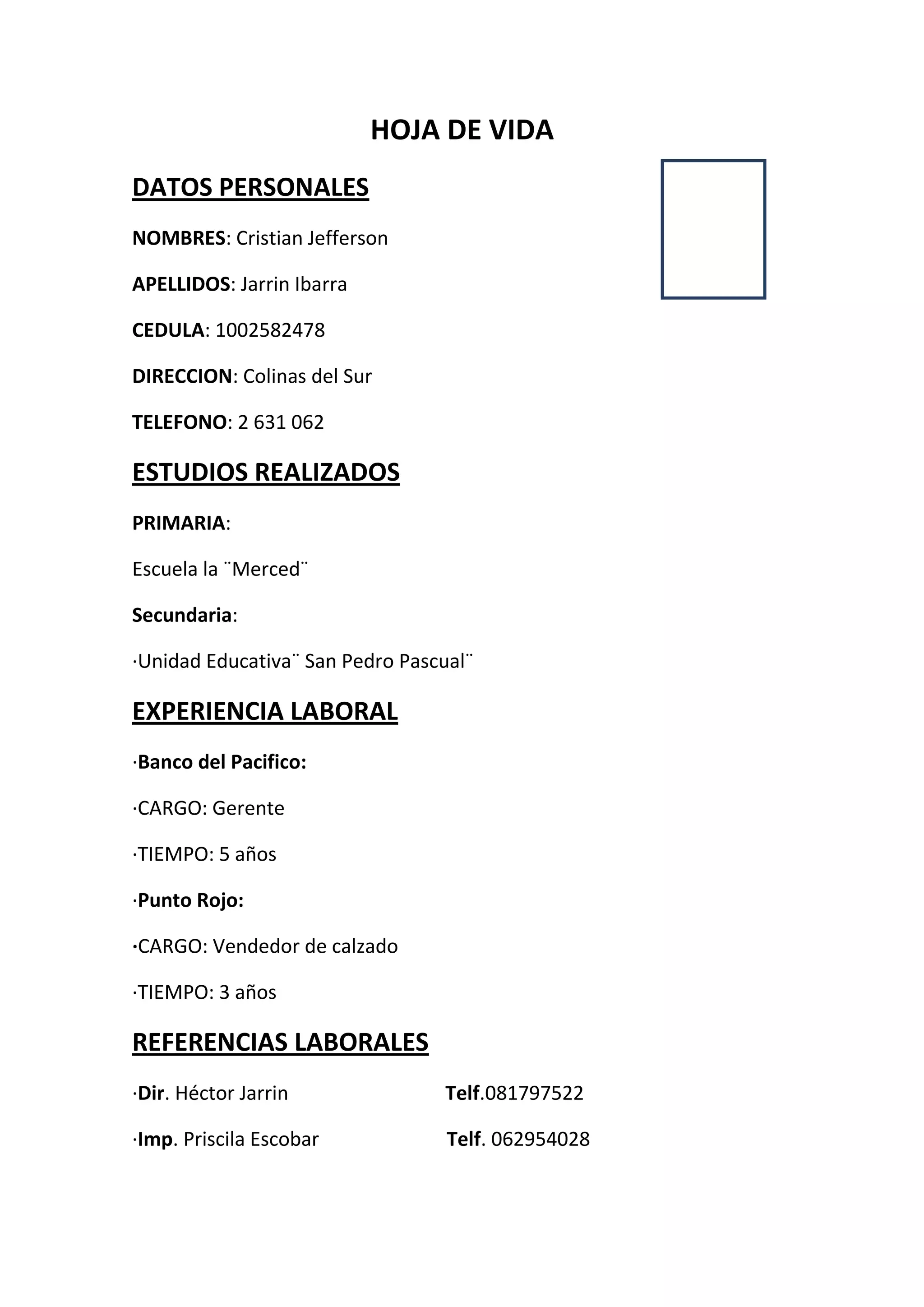 Cristian Jefferson Jarrin Ibarra busca empleo. Estudió primaria en la Escuela la Merced y secundaria en la Unidad Educativa San Pedro Pascual. Trabajó 5 años como Gerente en el Banco del Pacífico y 3 años como Vendedor de calzado en Punto Rojo. Sus referencias laborales son el Dir. Héctor Jarrin y la Imp. Priscila Escobar.