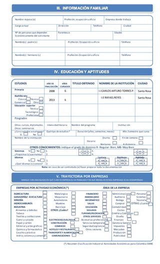 Este documento es una hoja de vida para solicitar empleo. Contiene información personal del solicitante como nombre, dirección, educación y experiencia laboral. También incluye secciones para referencias personales, afiliaciones a seguridad social, y observaciones del entrevistador. El objetivo es proveer los datos necesarios para que un empleador evalúe la candidatura para un puesto laboral.