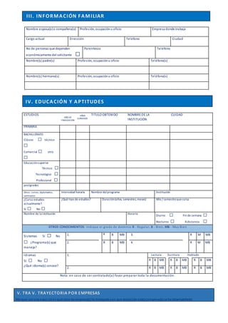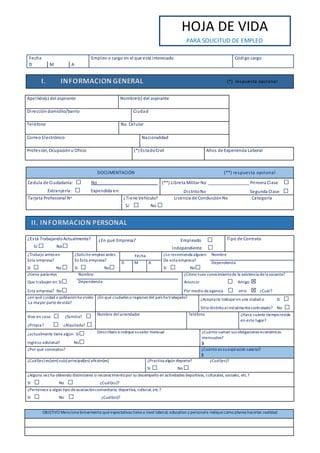 Este documento contiene una hoja de vida para solicitud de empleo. En 3 oraciones o menos: