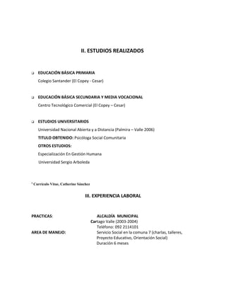 Este documento presenta la hoja de vida de Catherine Sánchez Sierra, psicóloga colombiana. Detalla su información personal, estudios universitarios como psicóloga social comunitaria, y experiencia laboral en diversas instituciones como la Alcaldía Municipal de Cartago, Casa de la Justicia, Unidad de Salud Los Sauces, y Personería Municipal de Ariguani. También incluye referencias personales de profesionales en el área de la salud y administración.