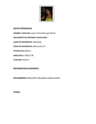 Luisa Fernanda Lugo Bonet nació en 1996 en Apartado y vive actualmente en cl-103/cr-96. Estudió secundaria en Institución Educativa santa maría y trabajó como secretaria en Banacol durante 2 años bajo la supervisión de Javier castaño. Proporciona como referencias laborales a Javier castaño de Banacol y como referencias personales a Tatiana robledo de Brigada xvll y Viviana Andrea Lugo de Efecty.