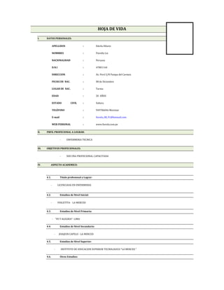 Este documento es un resumen de la hoja de vida de Fiorella Liz Dávila Hilario. Presenta sus datos personales como su nombre, edad, dirección, educación y objetivos profesionales. Su objetivo es obtener un título de Licenciada en Enfermería y actualmente estudia en el Instituto de Educación Superior Tecnológico "La Merced". No tiene experiencia laboral o distinciones académicas previas.