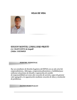 Edison Manuel Caballero Prieto presenta su hoja de vida, en la cual destaca su formación como tecnólogo en Gestión Logística del SENA. Cuenta con habilidades de liderazgo, emprendimiento y compromiso, además de ser dinámico y capaz de enfrentar retos. Nació en 1991 en Guatavita y actualmente tiene 20 años. Entre su experiencia se incluyen estudios en el SENA y el bachillerato académico. Brinda referencias personales y familiares para contacto.